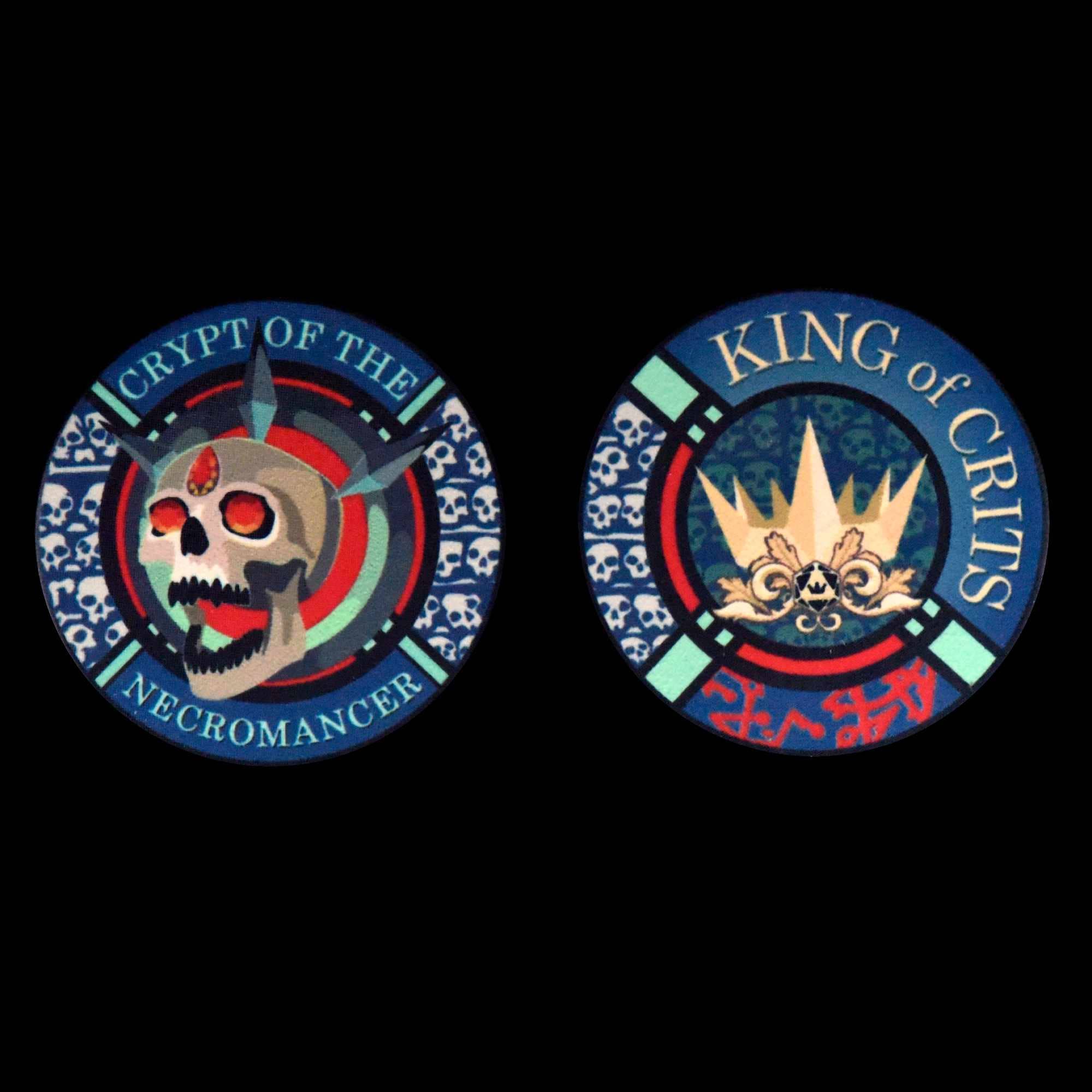 Introducing Crypt of the Necromancer: A King of Crits ™ Brand Original Design. Packaging: Display Bottle Special Features: * Semi-translucent green & blue design (randomly mixed) * 11 Dice Set with 4D6's and 2D20's * 4 Unique D6 Designs * Includes a Themed Ceramic Poker Chip as it's 12th piece * Exclusive DNDDICE.COM / King of Crits ™ Font & Artwork ©2025 12 Piece Set Includes: * 1-D4 (17mm) * 4-D6 (16mm) * 1-D8 (16mm) * 1-D10 (17mm) * 1-D% (17mm) * 1-D12 (18mm) * 2-D20 (21mm) * 1-Poker Chip (Ceramic) Material: Resin
